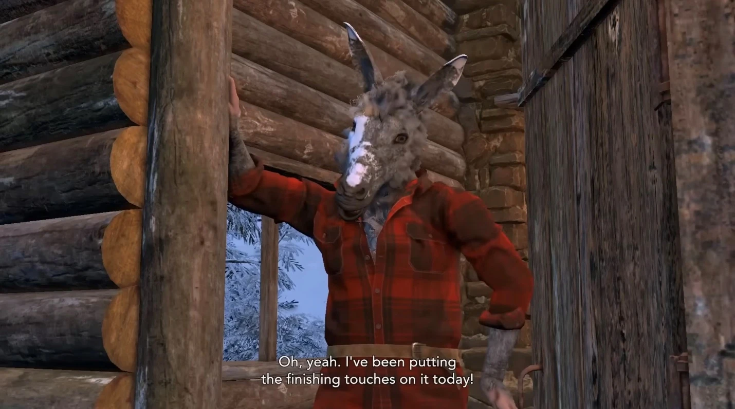 По словам ютубера Cuttyflame, после цепочки таких пропусков герой по имени Нейт в одно мгновение оказывается в заснеженной лесной хижине. Там начинается мета диалог, в котором Нейт и антропоморфный осел по кличке Мус рассуждают о кино, цирковых постановках и видеоигровых кат-сценах. Персонажи озвучены самими авторами проекта - Нейта озвучивает Гейб Куццилло, Муса озвучивает Беннетт Фодди.