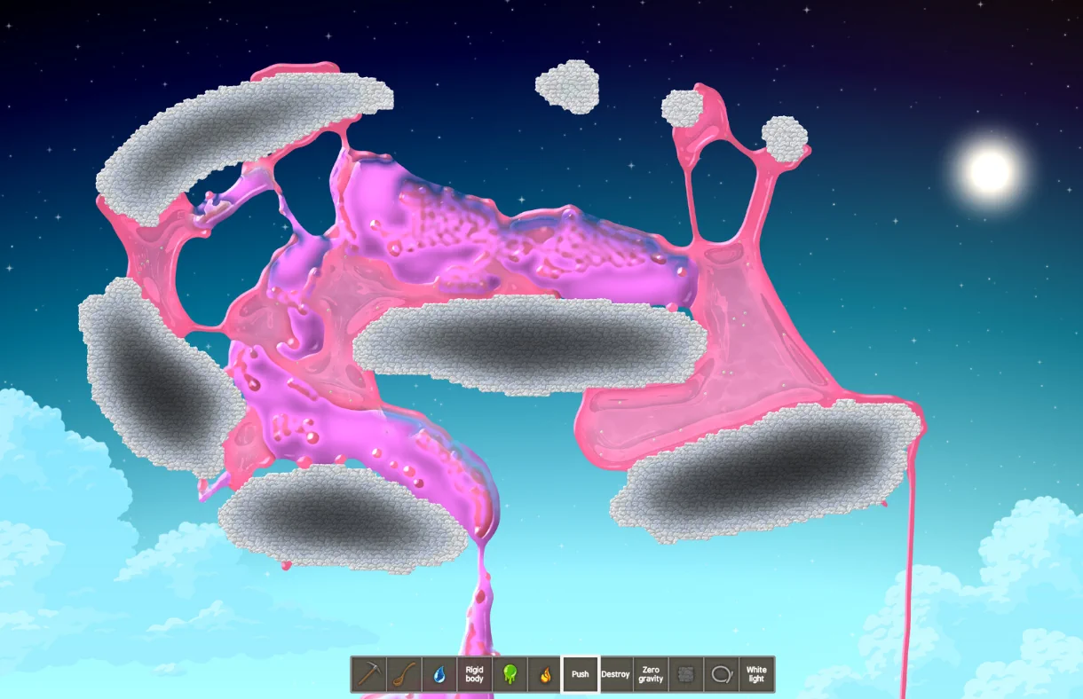 Игра Fractala Sandbox от студии Ludofractal представляет собой настоящий экспериментальный конструктор, в котором каждая частица подчиняется законам физики. Здесь игроки могут работать с десятками материалов: от текучей воды и вязкой лавы до липкого мёда, сыпучего песка, горючих веществ и даже взрывчатки. Всё это создаётся с помощью GPU-симуляции и технологий Position-Based Dynamics (PBD), что обеспечивает реалистичное поведение объектов и максимально живую среду.