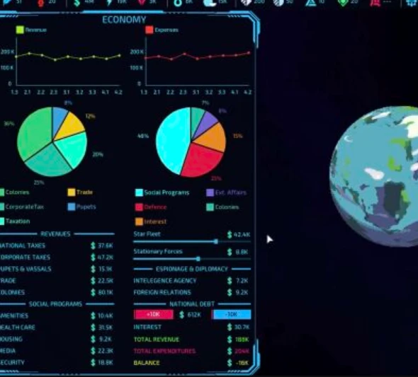 Экономический дашборд PLVS VLTRA - пошаговой 4X стратегии от разработчика Mithradates - создан так, чтобы за один взгляд понять откуда приходят кредиты и почему казна уходит в минус. Это не просто таблица, а стратегический фундамент всей игры, где графики линиями показывают тренды, круговые диаграммы раскрывают доли, а детальные раскладки фиксируют точные числа.